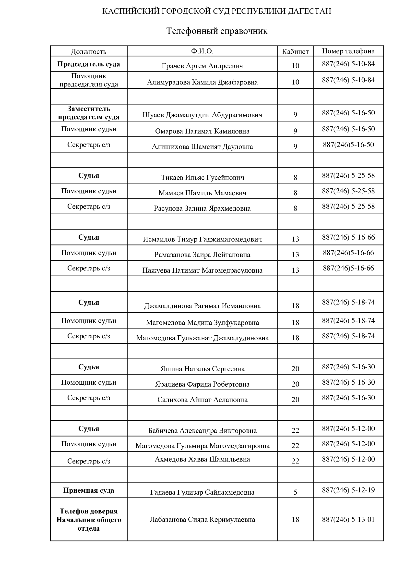 368300, Республика Дагестан, г. Каспийск, ул. Назарова, д. 15Тел.: (87246) 5-12-19kaspiyskiy.dag@sudrf.ru